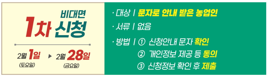 비대면 신청: 2월 1일(토) ~ 2월 28일(금) 개별 문자를 받은 농업인은 휴대폰 및 인터넷으로 간편하게 신청가능