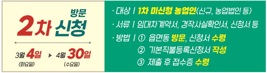 농지 직불금 2차 방문 신청은 3월 4일 (화)부터 4월 30일(수) 까지 가능합니다.